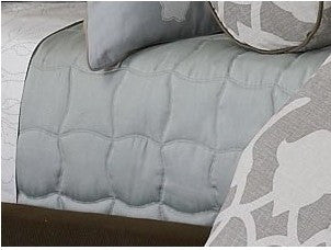 Barbara Barry quiet curve quilt, curved lines intertwine gracefully to create a modern twist on a classic quilt. This fine layering piece is made of lustrous cotton sateen with a plush lofty hand. European shams and a decorative pillow are added to make quiet curve a versatile addition to any bedding wardrobe.